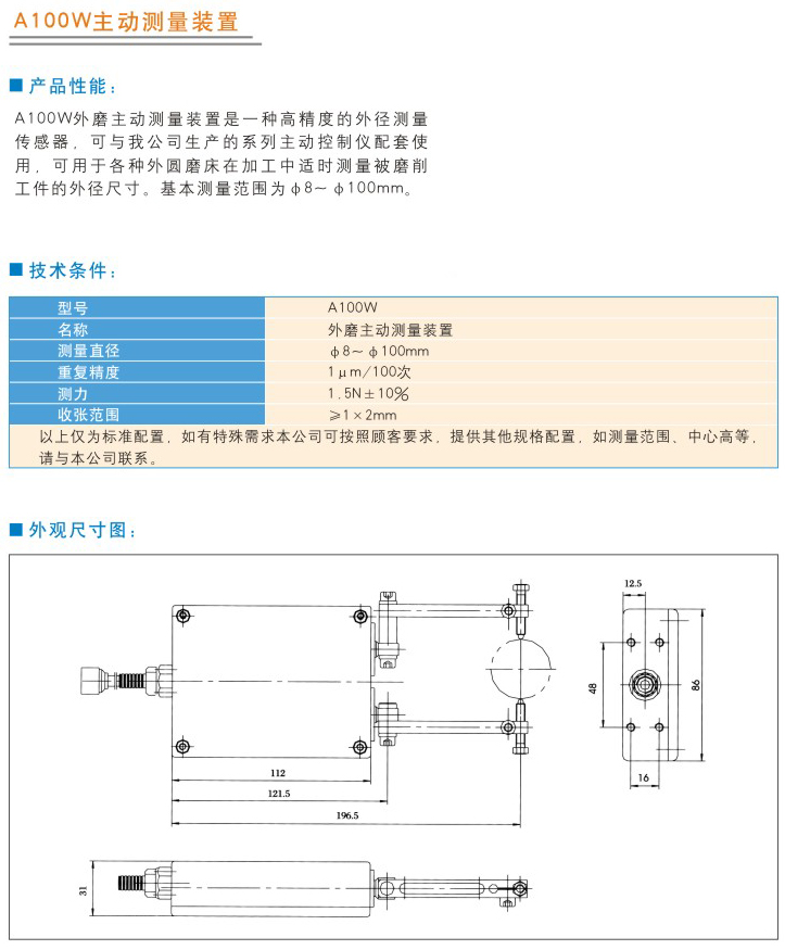 A1OOW外磨主動測量裝置 是 一種高精度的外徑測量傳感器。 可與我公司生產(chǎn)的系列主動控制一配套使用??捎糜诟鞣N外圓磨床在加工中適時 測量被磨削工件的外徑尺寸。基本測量范圍為φ3-φ100mm。具有防水、耐磨、耐碰撞的特點